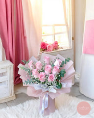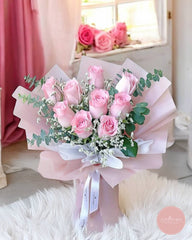 Immerse yourself in the soft hues of romance with our delightful bouquet featuring nine charming pink roses, gracefully encircled by the delicate clusters of caspia. This enchanting arrangement captures the essence of love and tenderness, making it a perfect gift for expressing admiration and affection. Revel in the beauty of these blooms as they bring a touch of elegance to your special moments. A heartfelt gesture from your trusted florist in Singapore, complete with reliable flower delivery to make every occasion memorable.