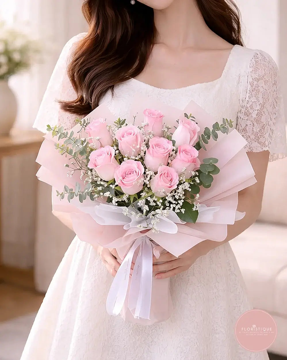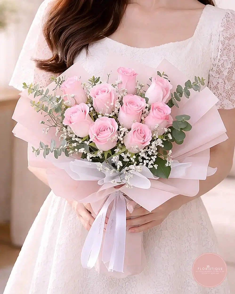 Immerse yourself in the soft hues of romance with our delightful bouquet featuring nine charming pink roses, gracefully encircled by the delicate clusters of caspia. This enchanting arrangement captures the essence of love and tenderness, making it a perfect gift for expressing admiration and affection. Revel in the beauty of these blooms as they bring a touch of elegance to your special moments.