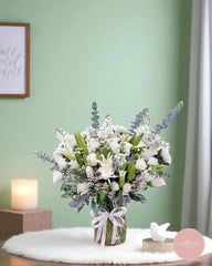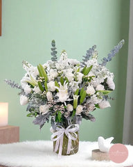 Elegant and serene, this arrangement centers around radiant white lilies, complemented by pristine tulips, soft roses, and sprays of baby’s breath. Framed with silver-hued eucalyptus and lush greenery, this bouquet embodies peace, purity, and comfort — perfect for expressing sympathy, offering encouragement, or simply celebrating a moment of still beauty.