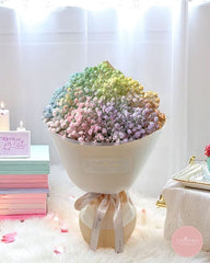 A pocket-sized burst of colour, this bouquet features dreamy pastel baby’s breath in a delicate rainbow gradient. Wrapped in an ivory-toned sleeve and tied with a satin ribbon, it’s a sweet and whimsical gift that radiates positivity and charm.