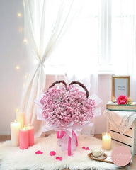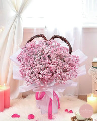 Soft pink baby's breath blooms form a graceful heart, delicately framed with rustic woven handles and wrapped in layers of pastel pink. This bouquet captures the essence of tenderness and heartfelt affection, perfect for expressing love in the gentlest way.