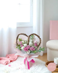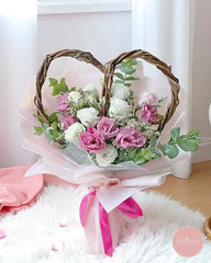 A delicate blend of blush pink and creamy white roses, surrounded by fresh eucalyptus and baby’s breath, framed with charming heart-shaped vines. Wrapped in soft pink and white, this bouquet radiates grace and affection—ideal for birthdays, anniversaries, or sweet romantic gestures.