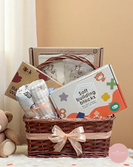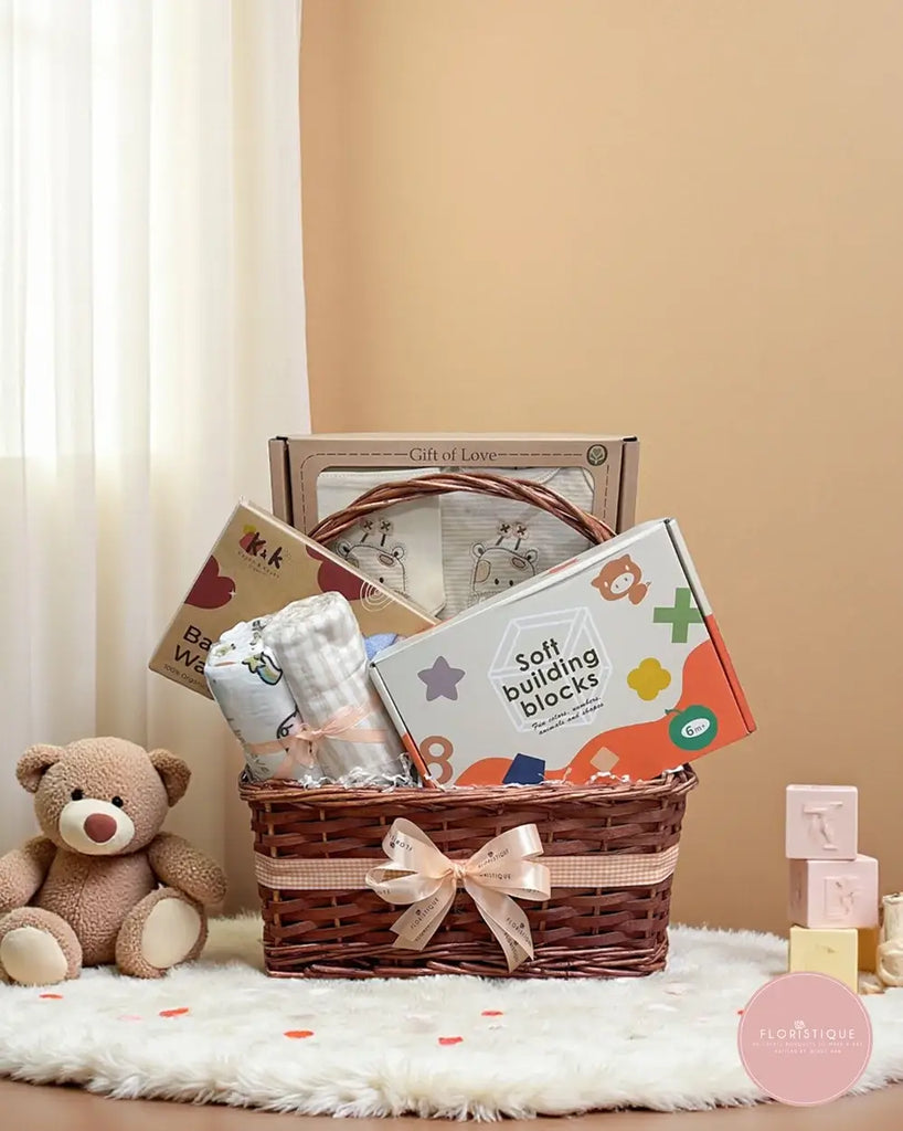 Welcome a newborn with this practical yet thoughtful baby gift hamper, beautifully presented in a classic wicker basket. This curated set includes soft muslin swaddles, a gentle baby essentials gift set, and colourful soft building blocks designed to spark creativity and playtime fun. Combining comfort with developmental play, this hamper is a wonderful balance of practicality and joy, making it an ideal present for both baby and parents.