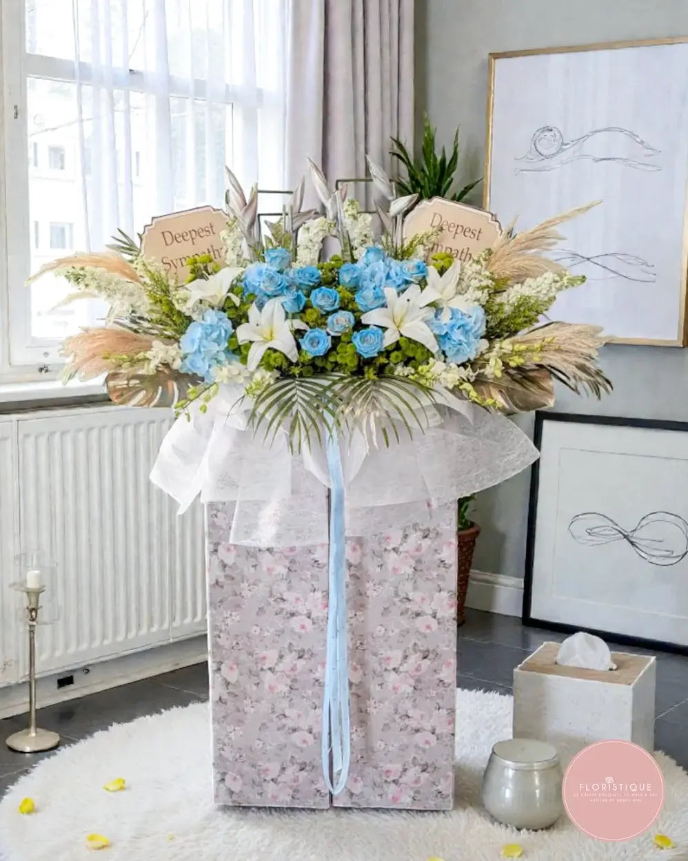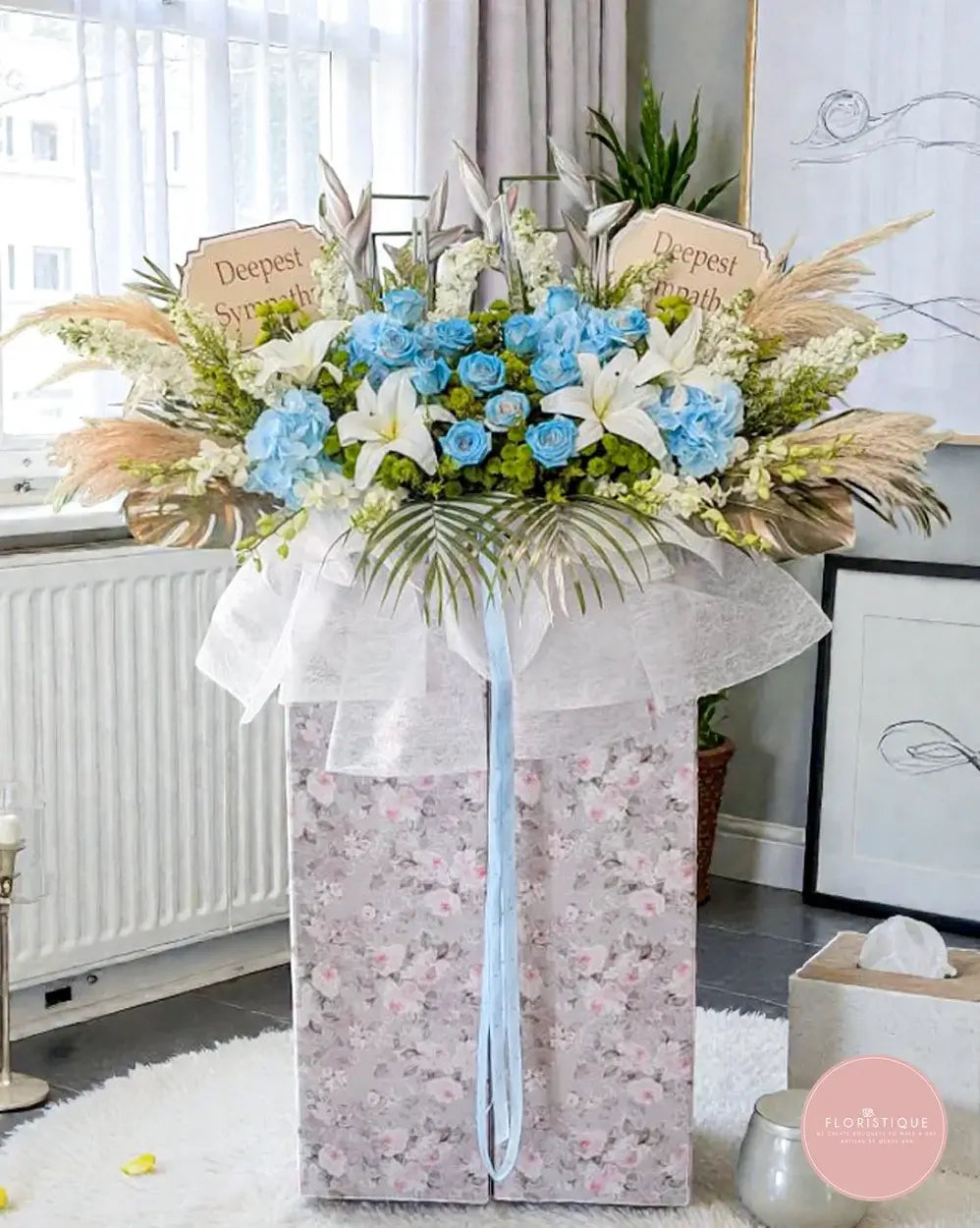 This serene condolence flower stand is thoughtfully arranged with soft blue roses, calming blue hydrangeas, and elegant white lilies, complemented by gentle greenery and natural dried accents. The soothing blue and white palette symbolises peace, remembrance, and heartfelt sympathy, offering quiet comfort during moments of loss. Wrapped in delicate layers of tulle and finished with a graceful ribbon, this tribute stands as a dignified expression of respect and everlasting remembrance.