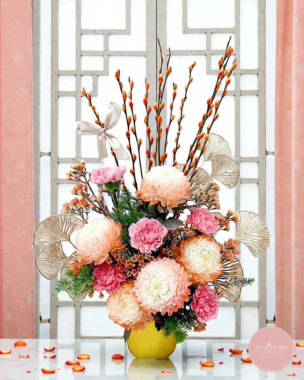 A joyful Chinese New Year arrangement featuring fluffy pom-pom chrysanthemums in creamy peach tones, paired with vibrant pink carnations and festive pussy willow branches to symbolise prosperity, growth, and rising luck. Accented with cheerful orange blooms and elegant gold fan details in a radiant golden pot, this statement piece is perfect for welcoming the new year at home or gifting to clients and loved ones with auspicious wishes.