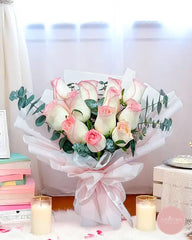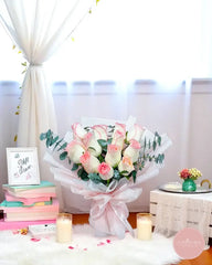 Gracefully arranged with cream roses tinged in soft blush pink, this bouquet exudes a quiet elegance and charm. Accented with fresh eucalyptus and wrapped in delicate pastel pink, it’s a symbol of admiration, gratitude, and gentle affection. Ideal for birthdays, anniversaries, or simply to show someone they’re loved.