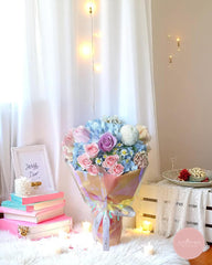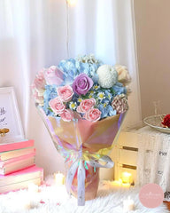 A radiant blend of sky-blue hydrangeas, dusty pink roses, lilac tones, and charming chamomile—this bouquet brings together a spectrum of pastels in a captivating iridescent wrap. Elegant and dreamy, it's a bouquet that celebrates colour with grace and sophistication.