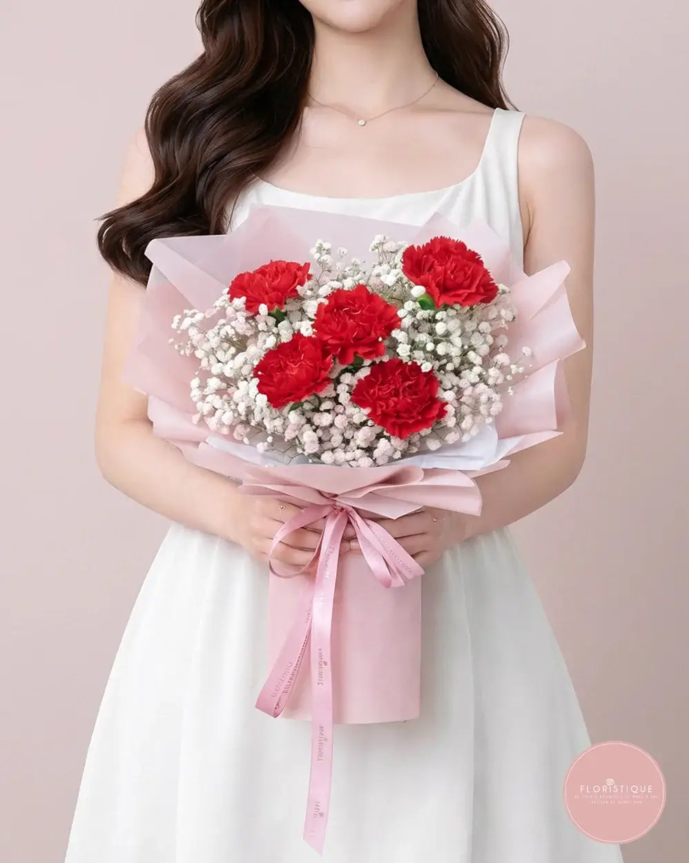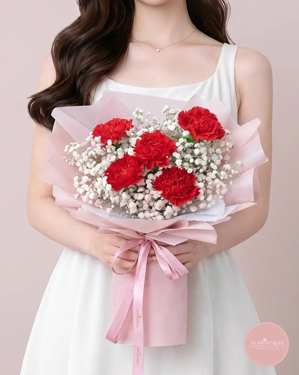 Bold and graceful, this bouquet features deep red carnations nestled among a cloud of delicate baby’s breath. Wrapped in soft blush pink paper and tied with a matching ribbon, it’s a classic yet heartwarming arrangement that conveys admiration, gratitude, and love.