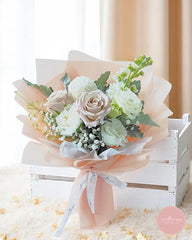 This elegant bouquet features soft pastel roses, white chrysanthemums, and delicate lisianthus, accented with lush greenery. Wrapped in peach-colored paper and tied with a white ribbon, it’s a perfect gift for any special occasion, radiating beauty and grace.