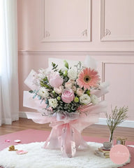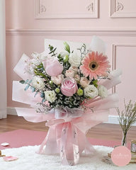Soft and elegant, this bouquet features a charming mix of pink roses, white eustoma, and a pastel gerbera, accented with delicate fillers and greenery. Wrapped in blush pink paper and finished with a satin ribbon, it makes a beautiful gift for birthdays, anniversaries, or simply to brighten someone’s day.