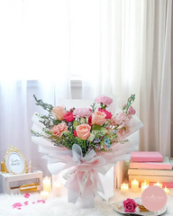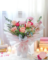 A charming mix of coral roses, blush carnations, and blue accents, this bouquet is thoughtfully arranged with seasonal fillers and soft greenery. Wrapped in pastel pink with a flowing satin ribbon, it brings a sweet, cheerful warmth to any setting.