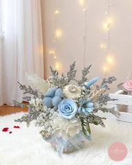 This exquisite preserved arrangement features a single sky-blue everlasting rose seated atop a lush white hydrangea base, surrounded by delicate bleached bunny tails, wheat stalks, and wispy statice. Each element is artfully selected and treated to maintain its natural beauty, offering months of effortless elegance without maintenance.
