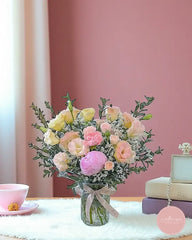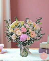 A graceful blend of blush peonies, soft yellow and cream roses, and delicate pink carnations, elegantly styled in a glass vase with baby’s breath and soft foliage. This arrangement radiates serenity and charm, making it perfect for birthdays, get well wishes, or simply to brighten someone’s day.