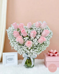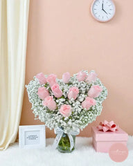 A classic expression of grace and affection, this heart-shaped arrangement features a dozen soft pink roses cradled in a delicate cloud of baby's breath. The pastel hues and tender textures evoke feelings of warmth, admiration, and sincere love, making it a timeless gift for birthdays, anniversaries, or romantic surprises.