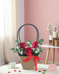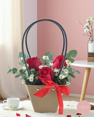 A charming fresh flower arrangement that radiates love and cheer. Featuring three velvety red roses paired with dainty chamomile daisies, fresh eucalyptus leaves, and lush greenery, this design is beautifully presented in a kraft bag with sleek black handles. A bold red satin ribbon adds the perfect finishing touch.