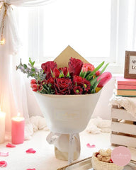 Make a bold statement with this striking arrangement of red tulips, roses, and vibrant fillers—artfully arranged in an elegant bloom box. Symbolising passion and admiration, this bouquet is the perfect choice for romantic gestures, anniversaries, or heartfelt congratulations.