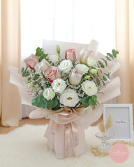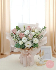 A refined arrangement of nude-toned and creamy white eustomas, delicately paired with white eustoma, baby's breath, and eucalyptus foliage. Wrapped in soft beige hues and tied with a satin ribbon, this bouquet offers a timeless expression of elegance — perfect for anniversaries, birthdays, or elegant thank-you gifts.