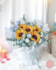 A radiant mix of golden sunflowers and delicate sky-blue spray roses, artfully accented with silvery eucalyptus and wrapped in soft white organza. As a leading florist for sunflower bouquets in Singapore, we hand-select each bloom to ensure lasting freshness and vibrant beauty. The cheerful sunflowers symbolize warmth and loyalty, perfectly balanced by serene blue roses for a truly uplifting display.