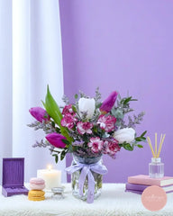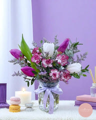 This elegant vase features a striking blend of purple and white tulips, paired with vivid alstroemeria and misty lilac fillers. A sophisticated floral piece that brings a refined pop of color to any space—ideal for expressing gratitude, love, or celebration.