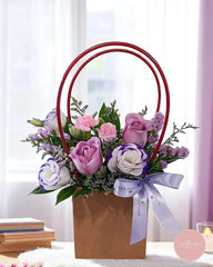 An elegant bag arrangement featuring lavender roses, violet-edged eustoma, pink mini carnations, and dainty filler blooms. Presented in a chic kraft bag with red loop handles and tied with a lilac satin ribbon, this piece blends charm and sophistication in a compact design.
