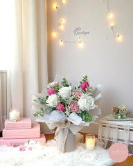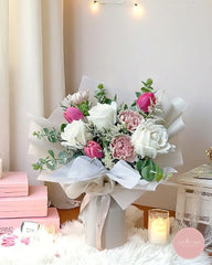 This refined bouquet brings together the classic beauty of white roses, soft blush carnations, and vibrant pink tulips, accented with delicate fillers and eucalyptus foliage. Wrapped in a neutral-toned matte finish, it’s a graceful gift for expressing love, appreciation, or celebration.