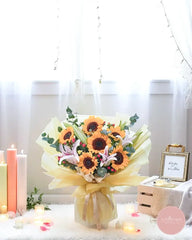 Bright and uplifting, this bouquet features a striking ensemble of golden sunflowers, delicate pink lilies, vibrant hypericum berries, and lush eucalyptus — all wrapped in warm yellow tones and finished with soft satin ribbon. A cheerful gift that captures joy, positivity, and heartfelt warmth.