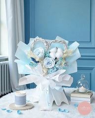 Soft and romantic, this keepsake frames icy-blue preserved roses with fluffy cotton, hydrangea and feathery accents inside a hand-twined rattan heart. Wrapped in cloud-blue and white with a generous bow, it brings a gentle, calming touch to bedside tables and work desks while staying picture-perfect for months. Totally low-maintenance—no watering needed; simply keep it cool and dry away from direct sun. A meaningful gift for proposals, anniversaries, baby boy celebrations, graduations or a sweet “just because,” thoughtfully handcrafted by our florist in Singapore to arrive full, balanced and photo-ready.