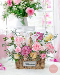 Overflowing with pastel roses, carnations, lisianthus, and delicate fillers in shades of pink, purple, yellow, and cream, this lush basket exudes garden-fresh elegance. Carefully arranged in a rustic woven basket with a charming “Flowers” patch and satin ribbon, it’s the perfect gift to convey love, gratitude, or celebration.