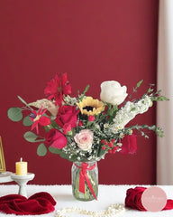 This vibrant vase arrangement showcases a passionate mix of red roses, cheerful sunflower, crisp white rose, and striking red gerbera, complemented by pink rose and soft foliage. Arranged in a clear glass vase and tied with a red ribbon, it exudes bold elegance and heartfelt warmth—perfect for romantic gestures or celebratory moments.