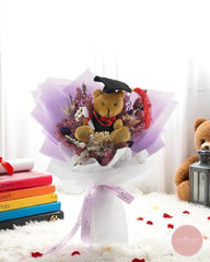 Send your heartfelt congratulations with this charming bouquet featuring a cuddly teddy bear in graduation attire nestled amidst preserved lavender-toned florals. Delicate, rustic, and full of personality, this arrangement makes a memorable gift for celebrating academic milestones.