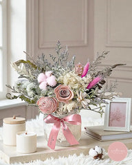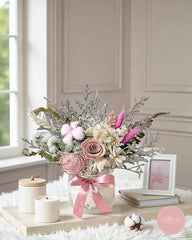 Soft blush and nude tones meet airy textures in this long-lasting preserved flower arrangement—featuring preserved roses, hydrangea, sola blooms, fluffy cotton and meadow fillers in a ribbed glass jar with a satin bow. Elegant and low-maintenance (no watering needed), it’s a lovely keepsake for birthdays, anniversaries, housewarmings or a sweet “thinking of you,” styled by our online florist in Singapore.