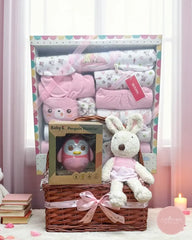 A sweet baby hamper thoughtfully curated for the arrival of a baby girl. This set includes a pink baby clothing set with matching essentials, an adorable plush bunny toy, and a playful penguin wobbler toy — all beautifully presented in a woven basket and finished with a satin ribbon. Both practical and charming, it’s the perfect way to celebrate a little princess.