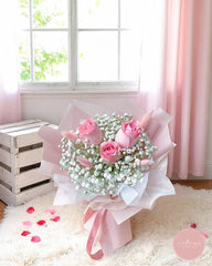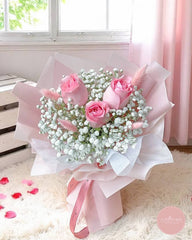 Celebrate elegance with our charming pink rose bouquet. Featuring three delicate pink roses surrounded by lush baby's breath and soft pink accents, this arrangement is beautifully wrapped in pastel pink paper. Perfect for expressing love and admiration on any occasion. A graceful creation by your trusted florist in Singapore, available with prompt flower delivery for every heartfelt moment.