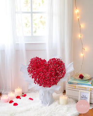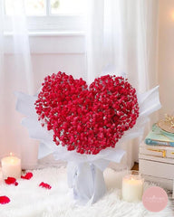 A striking symbol of everlasting love, this heart-shaped bouquet features a lush cloud of crimson baby’s breath, artfully arranged and wrapped in elegant white layers. Bold yet delicate, it captures the essence of pure devotion and timeless romance.