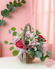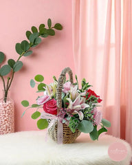 This charming basket arrangement features graceful pink lilies, lush red and blush roses, delicate eustoma, and sprigs of fresh greenery including eucalyptus leaves. Beautifully presented in a rustic woven basket and finished with a soft pink ribbon, it radiates both elegance and affection.