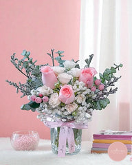 Delicately arranged with blush pink roses, cream spray roses, and soft baby’s breath, this sweet vase arrangement evokes elegance and charm. Accented with silver foliage and soft berry details, it’s a tender expression of love and appreciation.