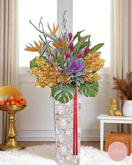 Make a grand impression with this vibrant and elegant grand opening flower stand. Featuring exotic birds of paradise, golden orchids, ginger blooms, and a striking ornamental cabbage centerpiece, this tropical-inspired arrangement brings energy, sophistication, and a touch of royal charm. Presented in a floral-patterned box and accented with lush greens and a bold red ribbon.