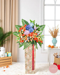 Brimming with colour and cheer, this grand opening flower stand showcases a joyful blend of orange gerberas, soft peach roses, and lush hydrangeas in shades of blue, lavender, and pink. Accented with tropical ferns and framed by bold greenery, this arrangement exudes celebration, creativity, and good fortune.