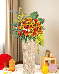 Radiating energy and positivity, this grand opening flower stand showcases a vibrant mix of sunflowers, red and orange gerberas, creamy roses, and cascading yellow orchids. Accented with eucalyptus and tropical leaves, and presented in a floral-patterned stand, this striking arrangement symbolizes growth, joy, and success.
