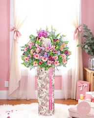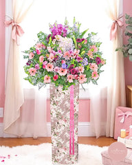 Soft, cheerful, and full of charm, this grand opening flower stand features a delightful mix of pink gerberas, lilies, purple statice, and hydrangeas in a wildflower-inspired arrangement. Set in a floral-printed stand and tied with a rosy pink ribbon, it embodies freshness, growth, and heartfelt congratulations.