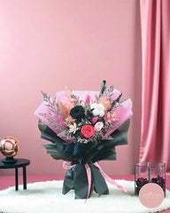 A bold composition of preserved black and red roses, offset by soft cotton blooms, blush-toned fillers, and rustic dried foliage. Wrapped in dramatic black and fuchsia paper, this bouquet is a striking gift that blends elegance with passion.