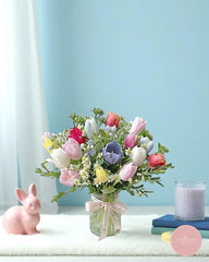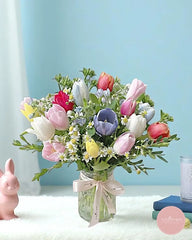 Brimming with soft pastel tulips in hues of lavender, blush, lemon, and coral, this enchanting vase arrangement captures the gentle joy of springtime. Accented with delicate chamomile blooms and fresh greenery, it evokes a serene garden scene in full bloom—perfect for brightening someone’s day.