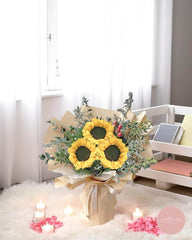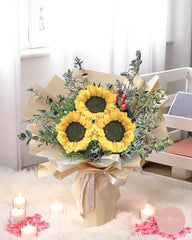Brighten someone's day with this rustic bouquet featuring three vibrant sunflowers, delicately accented with wild foliage and pops of pink fillers. Wrapped in kraft paper with a touch of elegance, this cheerful arrangement is perfect for birthdays, graduations, or just because.
