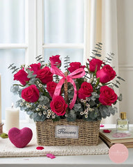 This charming basket arrangement features a lush gathering of velvety fuchsia roses nestled among silvery eucalyptus and dainty white blooms, all presented in a rustic woven basket and finished with a pretty pink ribbon bow. The mix of vibrant colour and cosy textures gives it a warm, romantic feel that looks beautiful on a dining table, console or office counter.