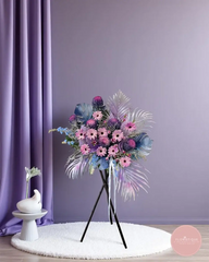 This bold and luxurious grand opening stand features an artistic blend of preserved thistles, pink gerbera daisies, and dyed purple-blue foliage, set against dramatic fan-shaped palm leaves and soft silver sprigs. The cool-toned palette evokes a sense of modern elegance and creative flair, making it a standout piece for any business launch or celebratory event. Thoughtfully styled with curated textures and preserved elements, this arrangement brings a long-lasting impression of sophistication and success.