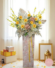 A radiant grand opening stand featuring bright yellow gerberas, elegant orchids, cappuccino hydrangeas, and lush foliage, accented with metallic gold ferns and palm leaves. Presented in a tall floral box with cascading yellow ribbons, this arrangement shines with joy, abundance, and celebration.