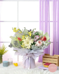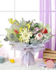 A joyful medley of yellow gerberas, red tulips, peach roses, yellow orchids, and soft fillers — this bouquet bursts with colour and cheer. Wrapped in pastel lavender and white, it's the perfect floral gift to celebrate birthdays, graduations, or to simply brighten someone’s day.