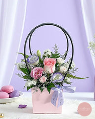 Soft and graceful, this pastel-themed floral bag features a delicate arrangement of pink roses, purple eustomas, champagne spray roses, and fresh seasonal fillers nestled in a sleek blush-pink paper bag, finished with a matching satin ribbon. The gentle hues and thoughtful presentation make it a timeless choice for any heartfelt gesture.