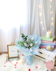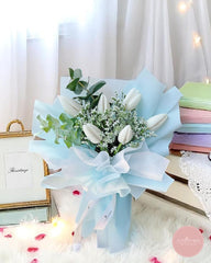 Understated and pure, this bouquet of pristine white tulips is paired with delicate fillers and eucalyptus foliage, wrapped in layers of soft blue and white with a satin ribbon finish. It conveys calm elegance, making it a graceful expression of peace and sincerity.