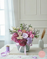 A romantic keepsake in soft lilac and blush, featuring preserved roses, hydrangea, carnation and airy fillers with fluffy cotton accents, arranged in a ribbed glass vase. Made with premium preserved flowers, this long-lasting arrangement stays beautiful with minimal care—no watering needed; simply keep it away from direct sun and humidity. Elegant, photo-ready and perfect for birthdays, anniversaries, housewarmings or a sweet “thinking of you.”